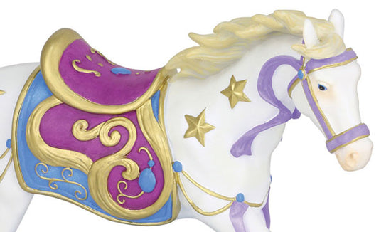 Starlight DanceWhile the earth appears dark and quiet below, “Starlight Dance” illuminates the sky above. As she runs through the night she leaves a gleaming trail of light behind her, and stardust falls from her golden hooves. This magical mare is dancing to the melody of the universe, and her beauty lights up the heavens.